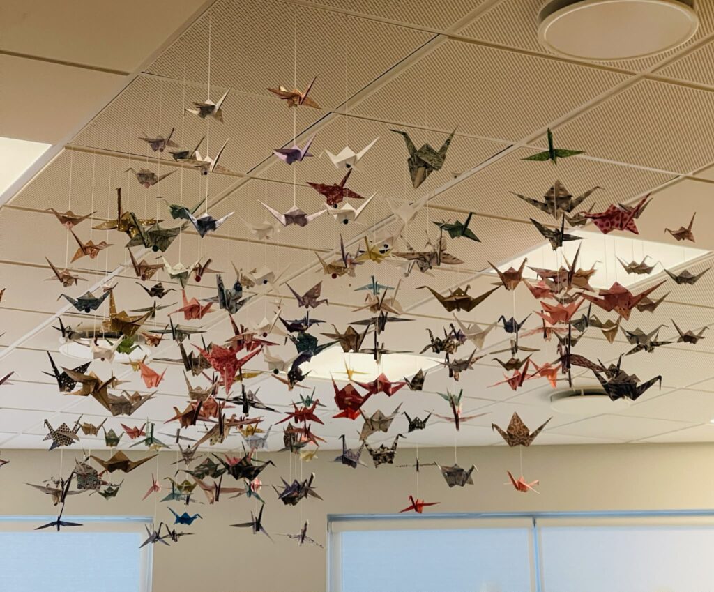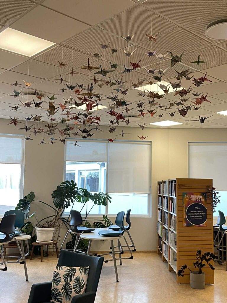 Borghildur og Bryndís buðu upp á vinnustofur á Opnum dögum í FVA 2025 og trönurnar hanga nú á bókasafni skólans. Gaman er að segja frá því að fyrrverandi nemandi skólans, Auður Vestmann, gaf verkefninu 100 trönur sem nú hafa bæst við á bókasafninu. Við þökkum Auði kærlega fyrir þessa gjöf.