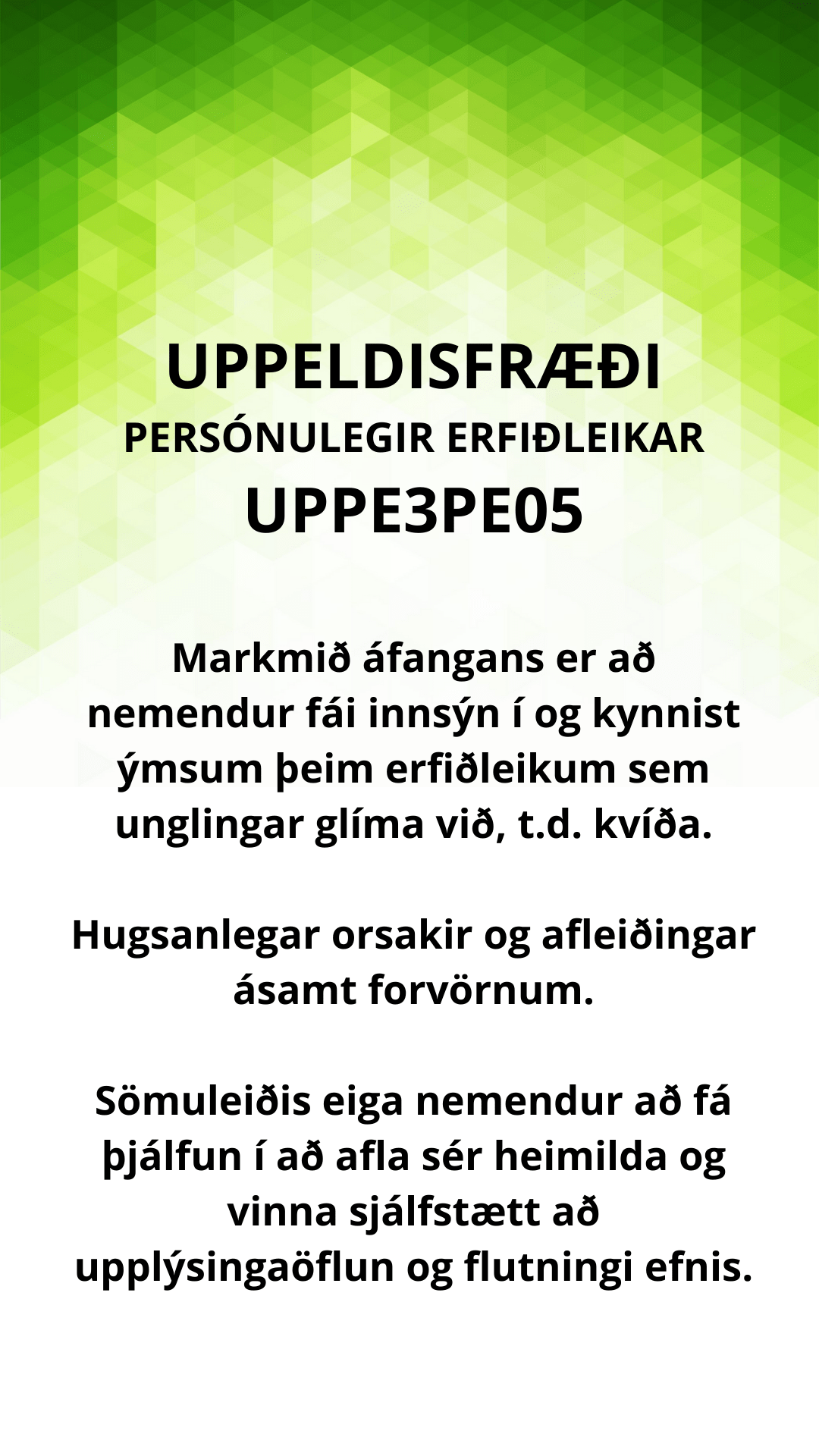 | UPPE3PE05 | Persónulegir erfiðleikar í uppeldisfræðum |