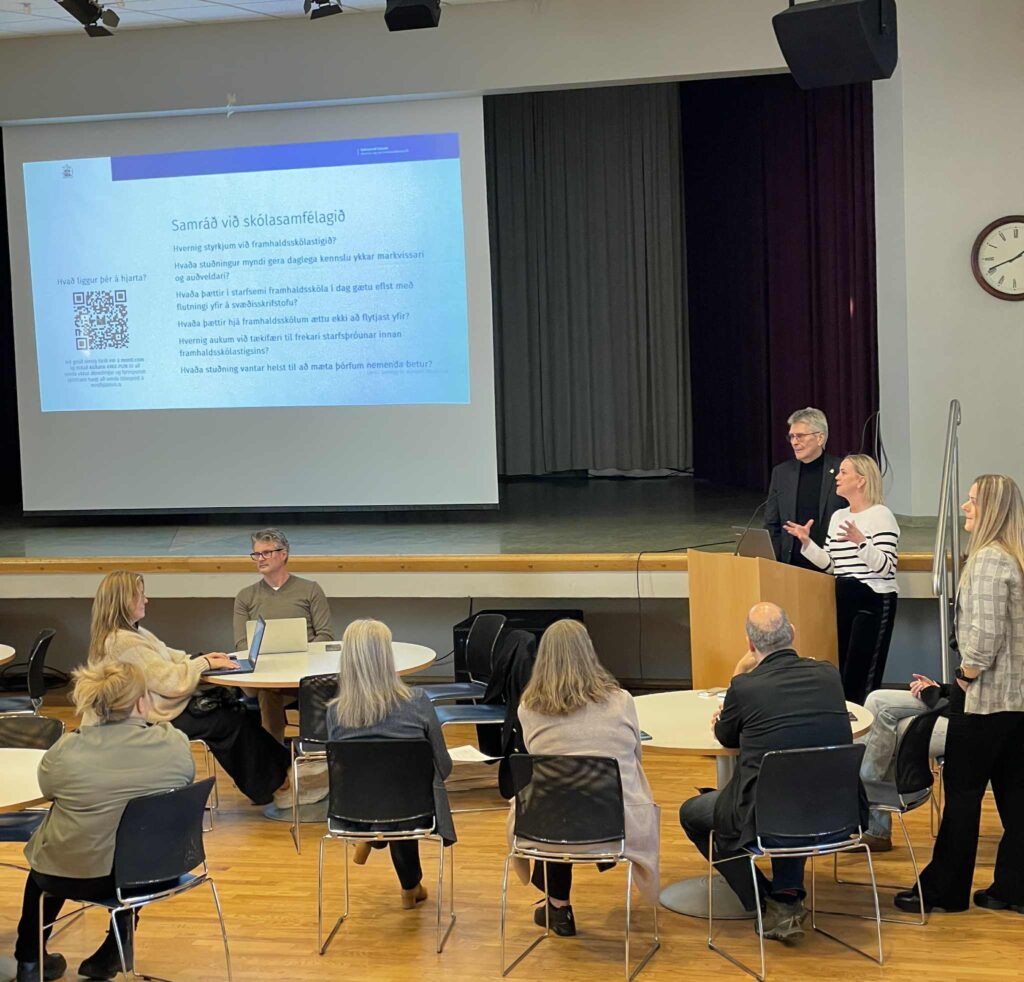 Guðmundur Ingi, ráðherra mennta- og barnamála, heimsótti FVA föstudaginn 14. nóvember ásamt fríðu föruneyti. Starfsfólk skólans og nemendur komu saman á fund til að hlýða á ráðherra og hans fólk ræða áform um breytingar á framhaldsskólastiginu og þau áhrif sem þær breytingar gætu haft á starfsemi skólans. Hugmynd hans gengur út á að stofna svæðisskrifstofu/r sem gegna eigi þjónustu- og eftirlitshlutverki skólanna. Ágætis umræður sköpuðust í lok fundarins og verður áhugavert að fylgjast með hvernig þetta fer.